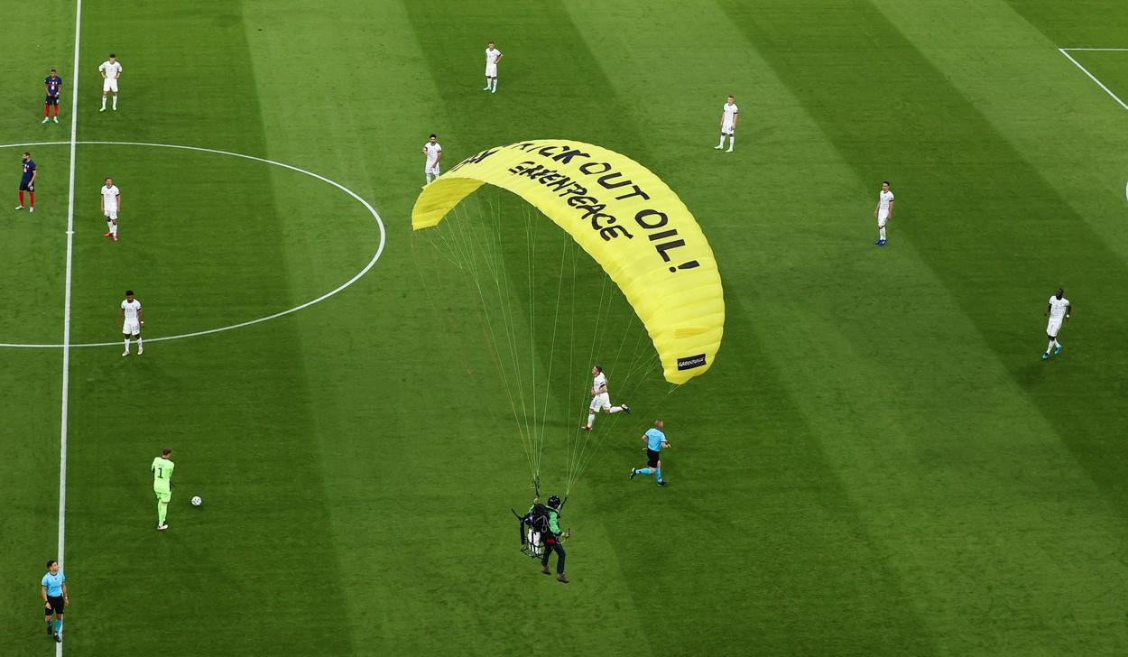 Momentul care nu s-a văzut la TV. Un activist Greenpeace a aterizat pe teren înainte de Franţa - Germania după ce s-a încurcat în cablurile camerelor TV - VIDEO
