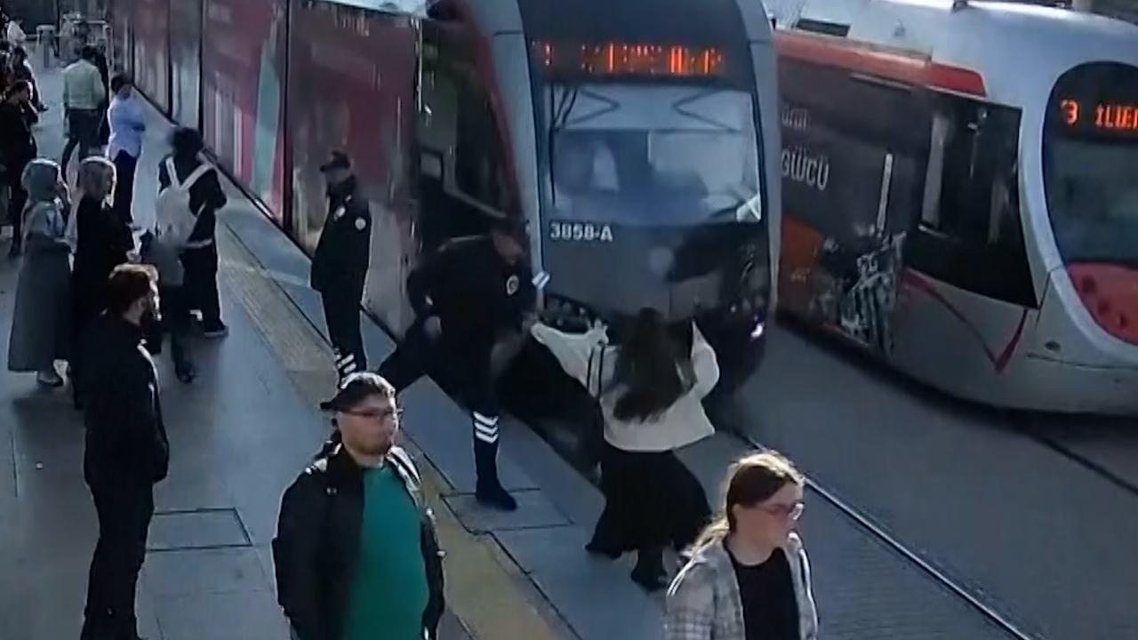 Momentul în care o femeie este trasă de pe şine din calea unui tramvai, în ultima secundă. Purta căşti