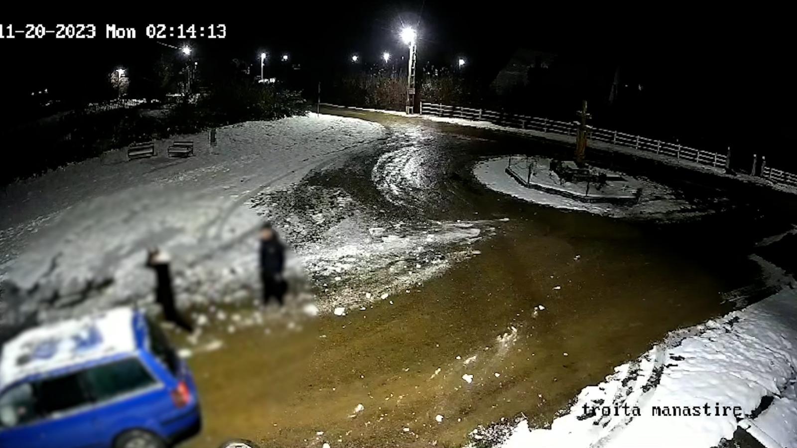 Momentul în care un minor se izbeşte de o troiţă cu maşina furată, în Suceava. Îşi pune apoi mâinile în cap, iar tovarăşul lui fuge cu plăcuţele