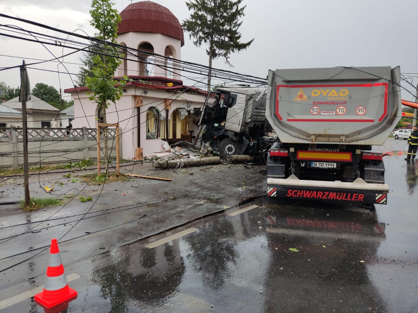 Momentul în care un TIR intră cu viteză în capela unei biserici din Titu. Camionul dărâmă zidul și un stâlp de electricitate