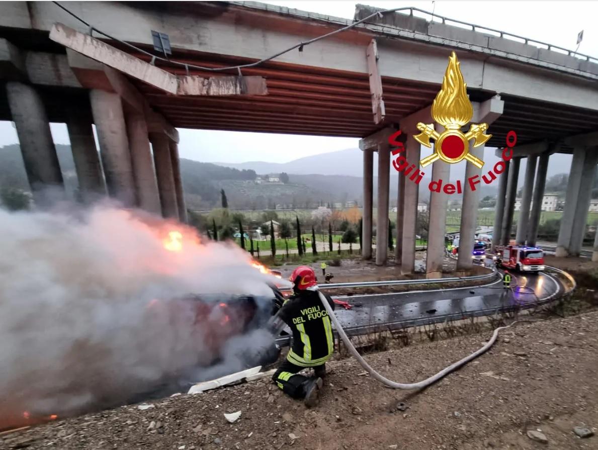 Momentul în care un TIR spulberă balustrada, ia foc și se prăbușește cuprins de flăcări de pe viaduct. Tragedie filmată la Calenzano, în Florența