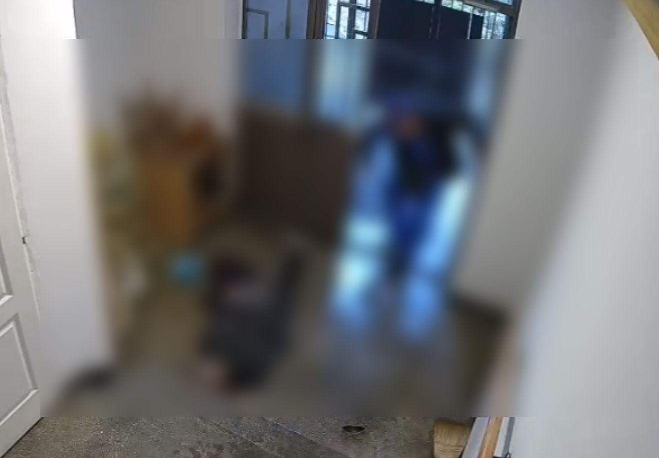 Momentul şocant când femeia din Bucureşti este incendiată de nepotul său în scara de bloc. Înainte, fusese lovită cu bestialitate cu piciorul în faţă