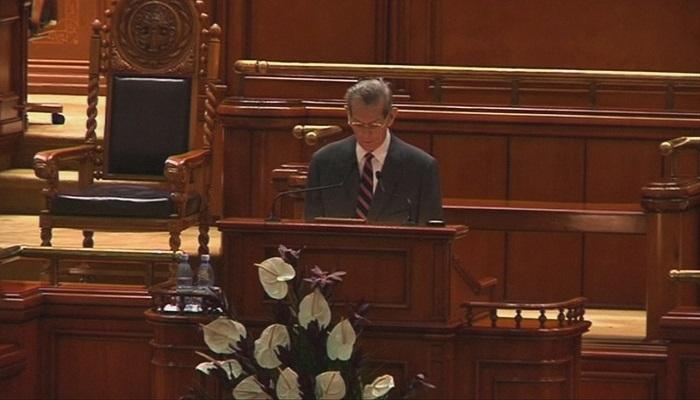 Regele Mihai în timpul discursului pe care l-a ţinut în Parlament, în 2011