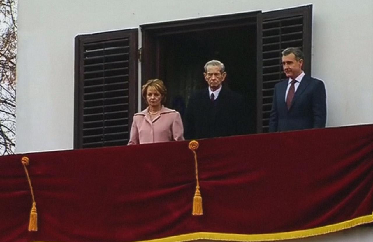 Regele Mihai, Principesa Margareta şi Principele Radu salută mulţimea care celebrează ziua fostului suveran, în 2014