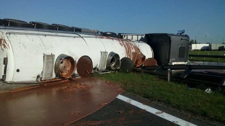 O cisternă plină cu 32 de tone de ciocolată s-a răsturnat pe o autostradă din Polonia şi a blocat complet traficul (video)
