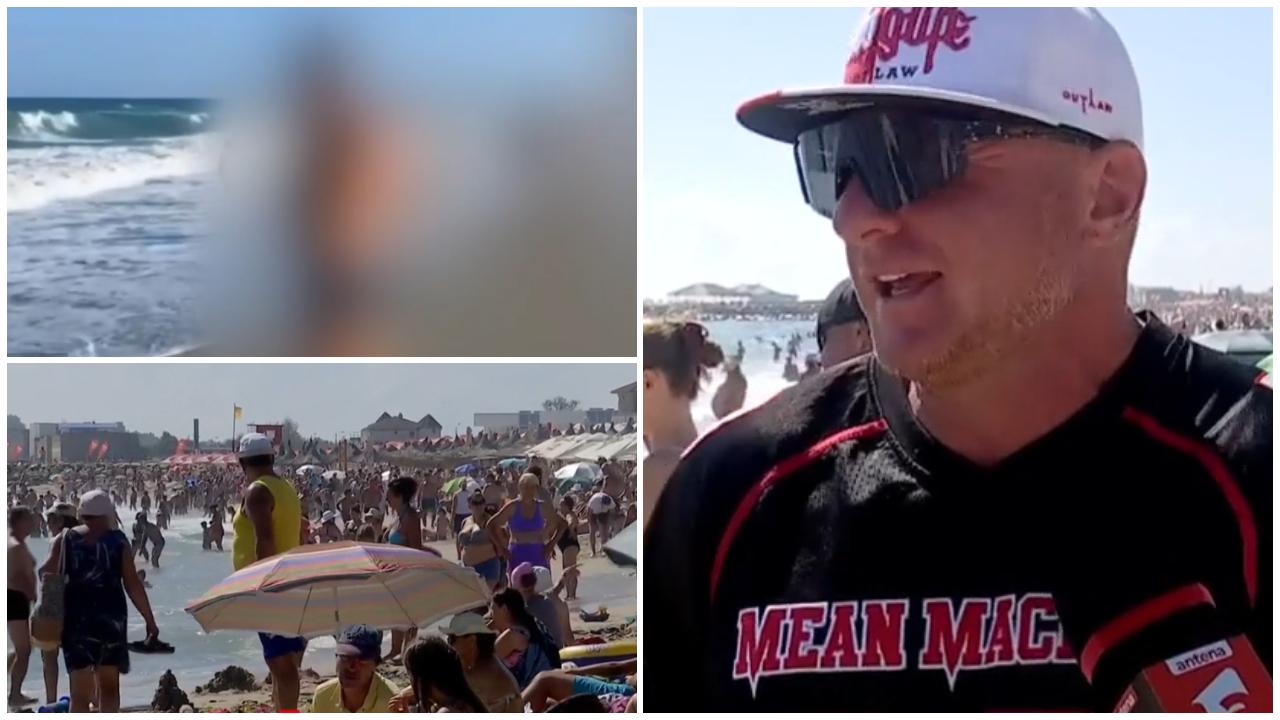 O mamă îşi încurajează băiatul să intre în mare, deşi e arborat steagul roşu: "Lasă-l, că aşa se căleşte!"