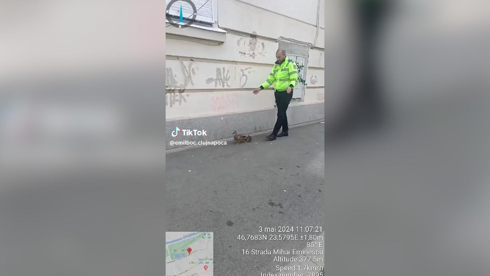 O mamă-raţă şi puii săi, conduşi de poliţiştii din Cluj spre lac. Misiune inedită pentru oamenii legii