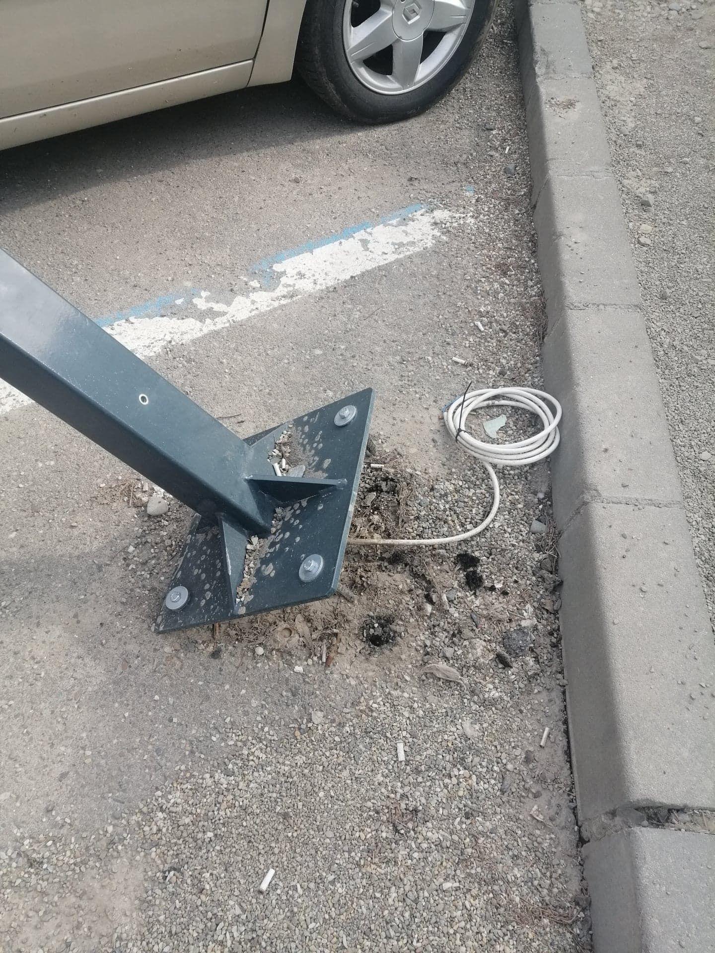 O maşină parcată, avariată de un indicator electronic montat recent. Piciorul de metal, prins în asfalt cu dibluri de tablouri | Imaginea 2 din 5 | Galerie Foto