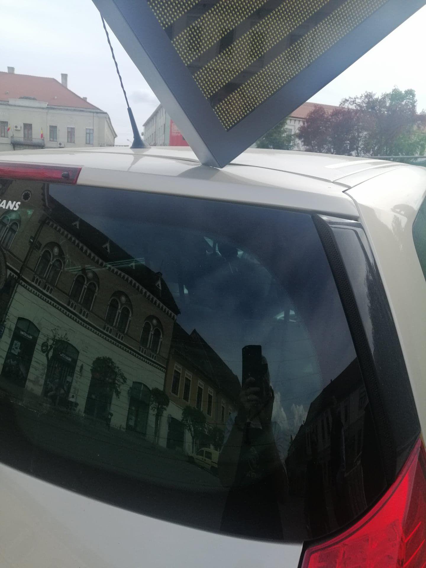 O maşină parcată, avariată de un indicator electronic monatat recent. Piciorul de metal a fost prins în asfalt cu dibluri de prins tablouri pe pereţi | Sursa foto: Fii Observator