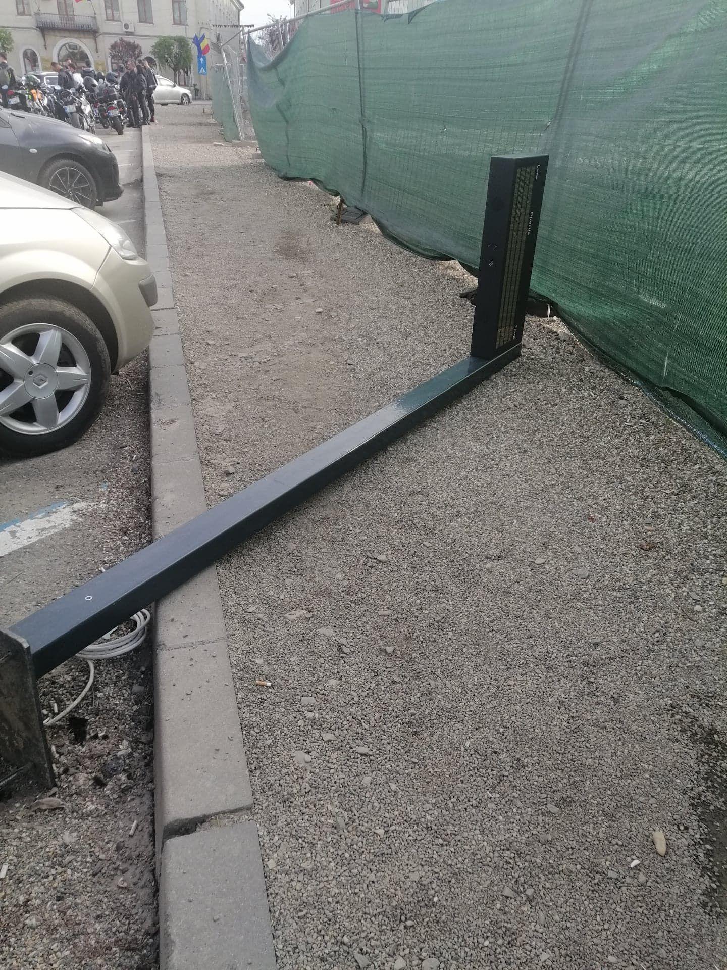 O maşină parcată, avariată de un indicator electronic montat recent. Piciorul de metal, prins în asfalt cu dibluri de tablouri | Imaginea 4 din 5 | Galerie Foto