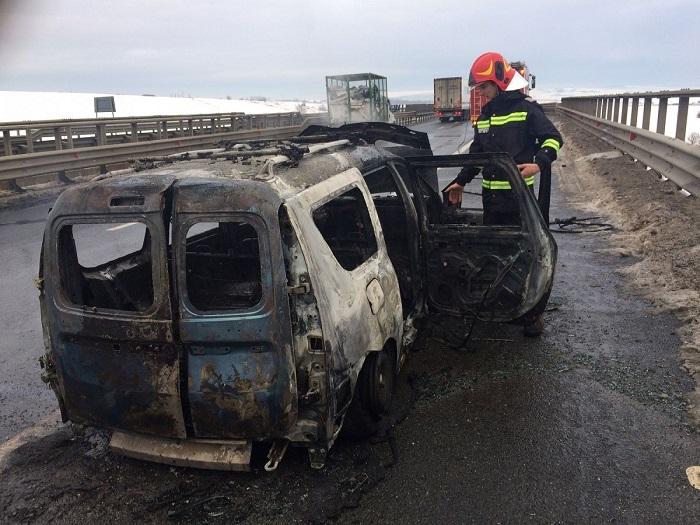 O maşină s-a făcut scrum pe autostrada Sibiu - Orăştie. Doi oameni şi-au văzut moartea cu ochii (video)