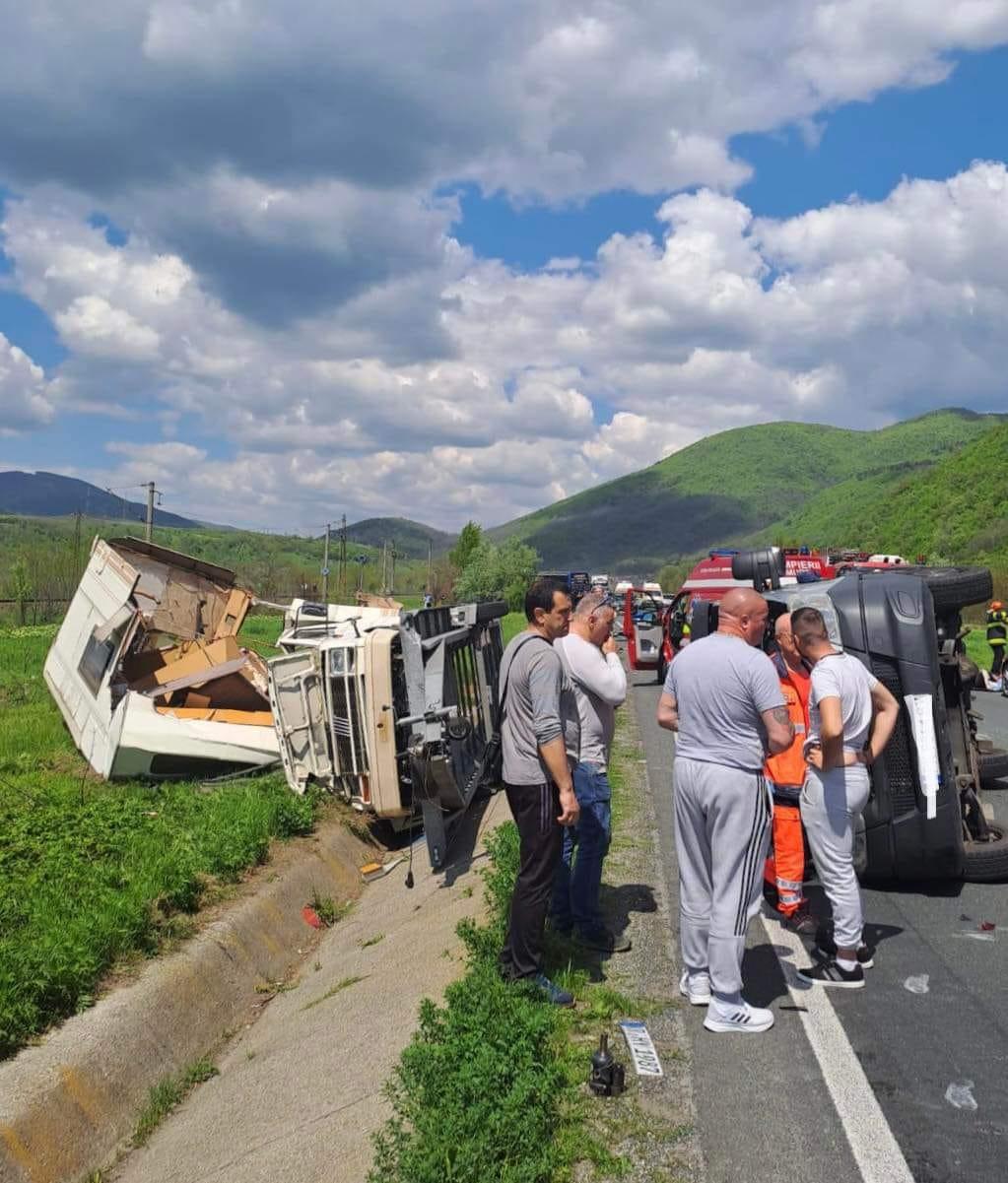 O persoană a murit, după ce un autocar, 3 autoturisme și o autoplatformă s-au ciocnit între ele, în Caraş-Severin. Bucăţi din maşini împrăştiate zeci de metri