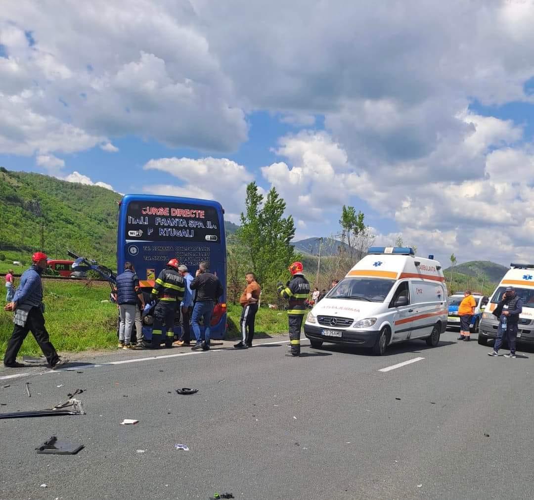 O persoană a murit, după ce un autocar, 3 autoturisme și o autoplatformă s-au ciocnit între ele, în Caraş-Severin. Bucăţi din maşini împrăştiate zeci de metri
