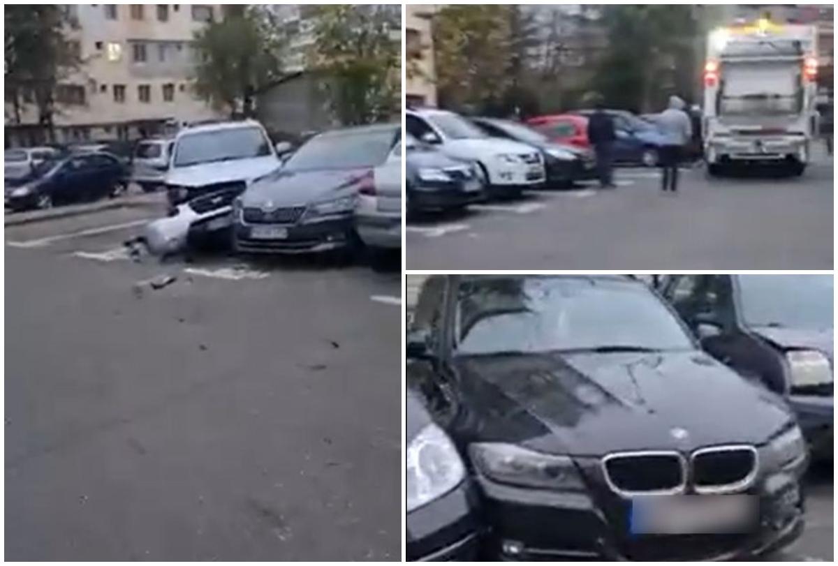 O şoferiţă de pe o maşină de gunoi a făcut prăpăd într-o parcare din Dâmboviţa. 7 autoturisme distruse dintr-un foc