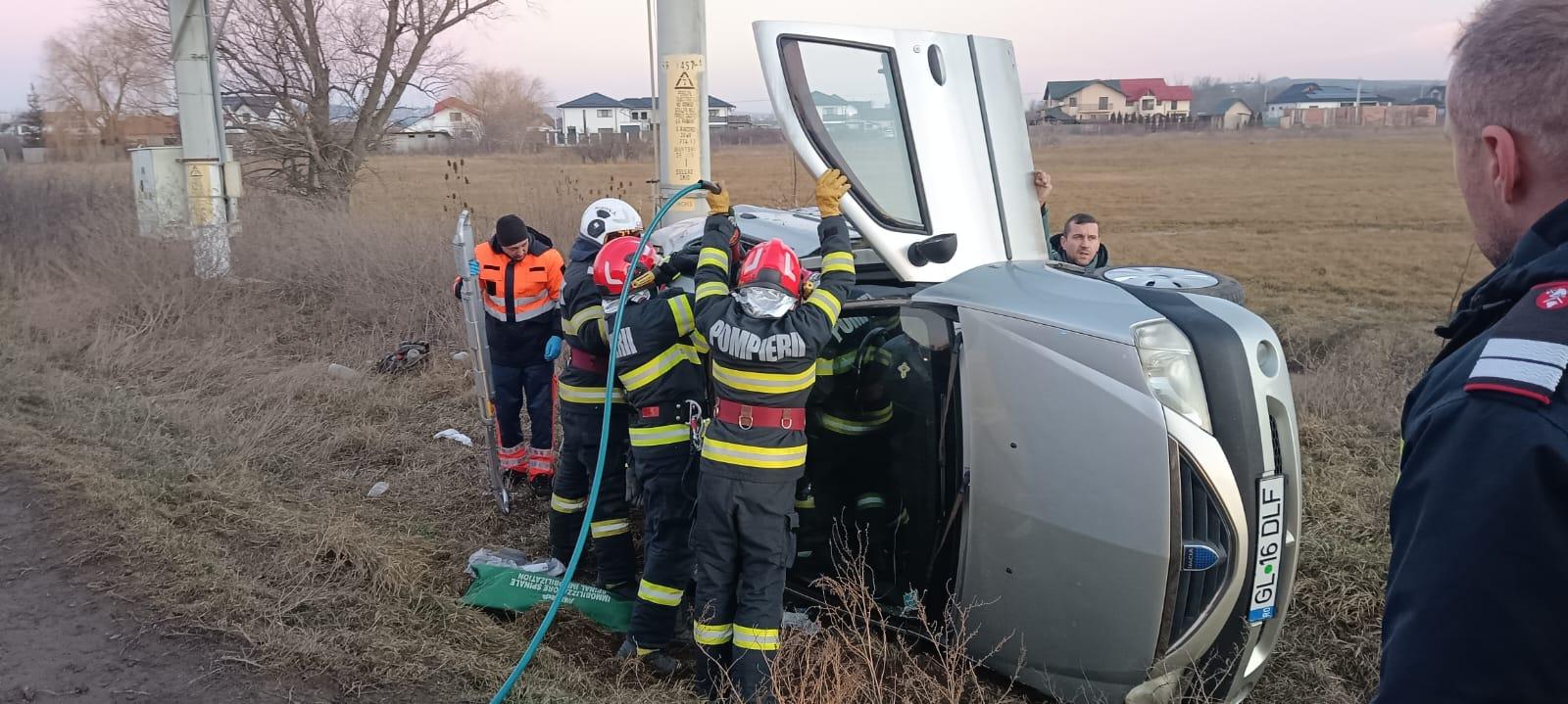 O şoferiţă din Vaslui a pierdut controlul volanului şi s-a răsturnat cu maşina: Trei persoane au fost rănite