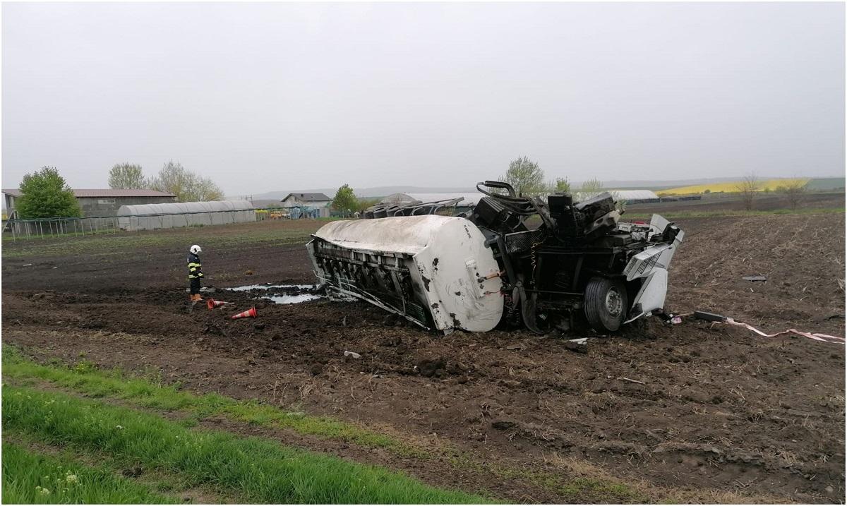 Pericol de explozie, după ce o cisternă cu motorină s-a răsturnat pe DN 2, în Neamţ. Traficul, oprit complet