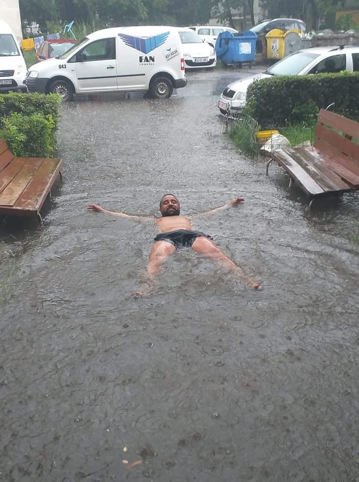 Piteştenii au ieşit să înoate în faţa blocului, după o ploaie torenţială care a inundat oraşul