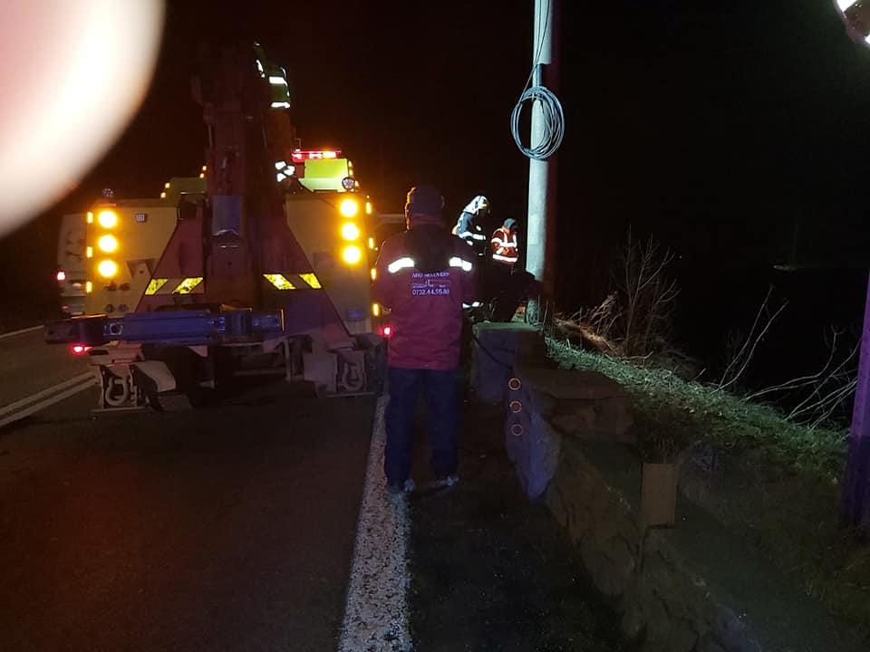 Platformă încărcată cu autoturisme, căzută în râul Olt. Şoferii, căutaţi cu scafandrii