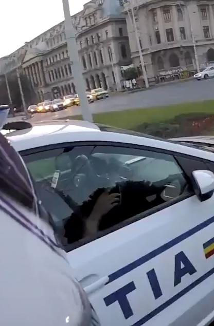 Un poliţist stă pe telefon la volan, într-o intersecţie în care maşinile trec pe roşu pe lângă el (video)
