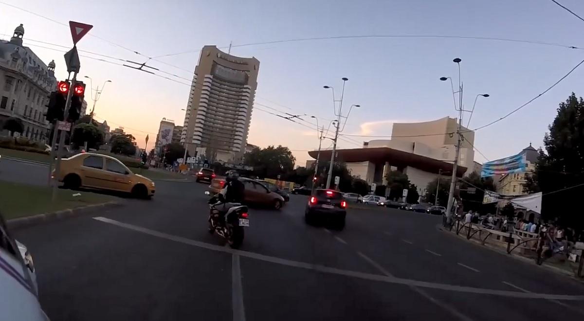 Un poliţist stă pe telefon la volan, într-o intersecţie în care maşinile trec pe roşu pe lângă el (video)