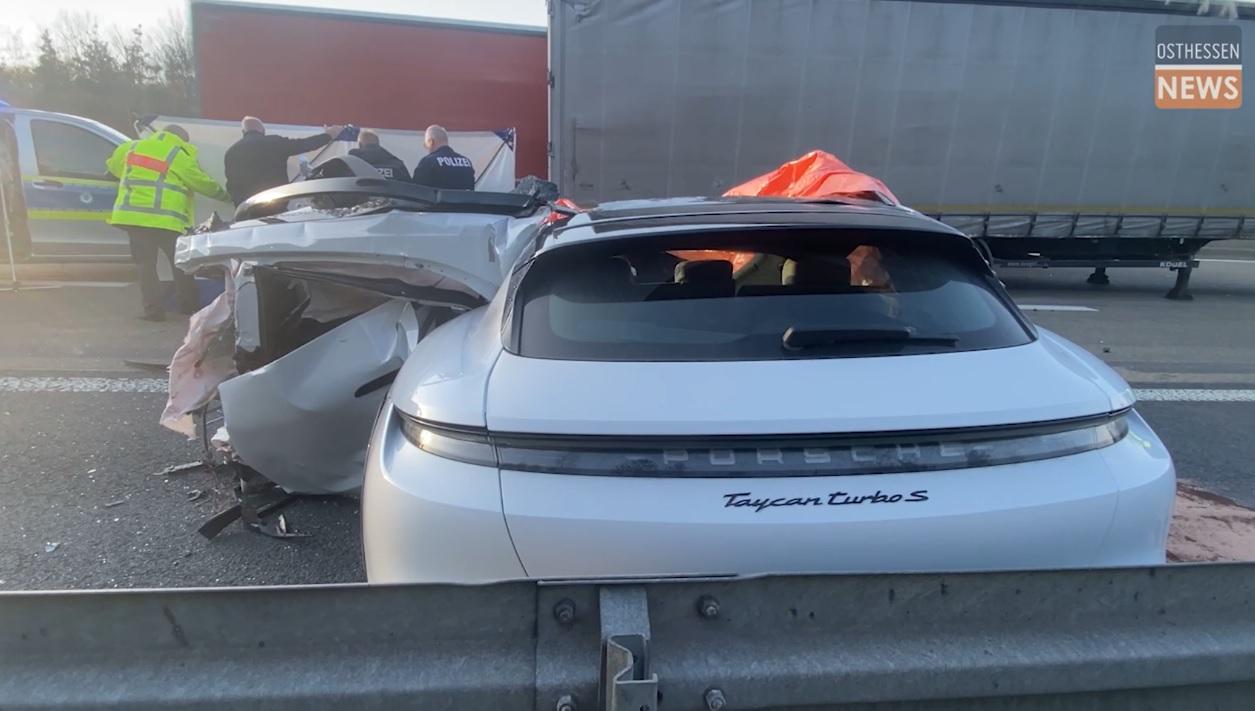 Porsche Taycan făcut bucăți, după ce a intrat cu viteză sub un TIR polonez. Imagini de groază pe autostrada A5, în Germania