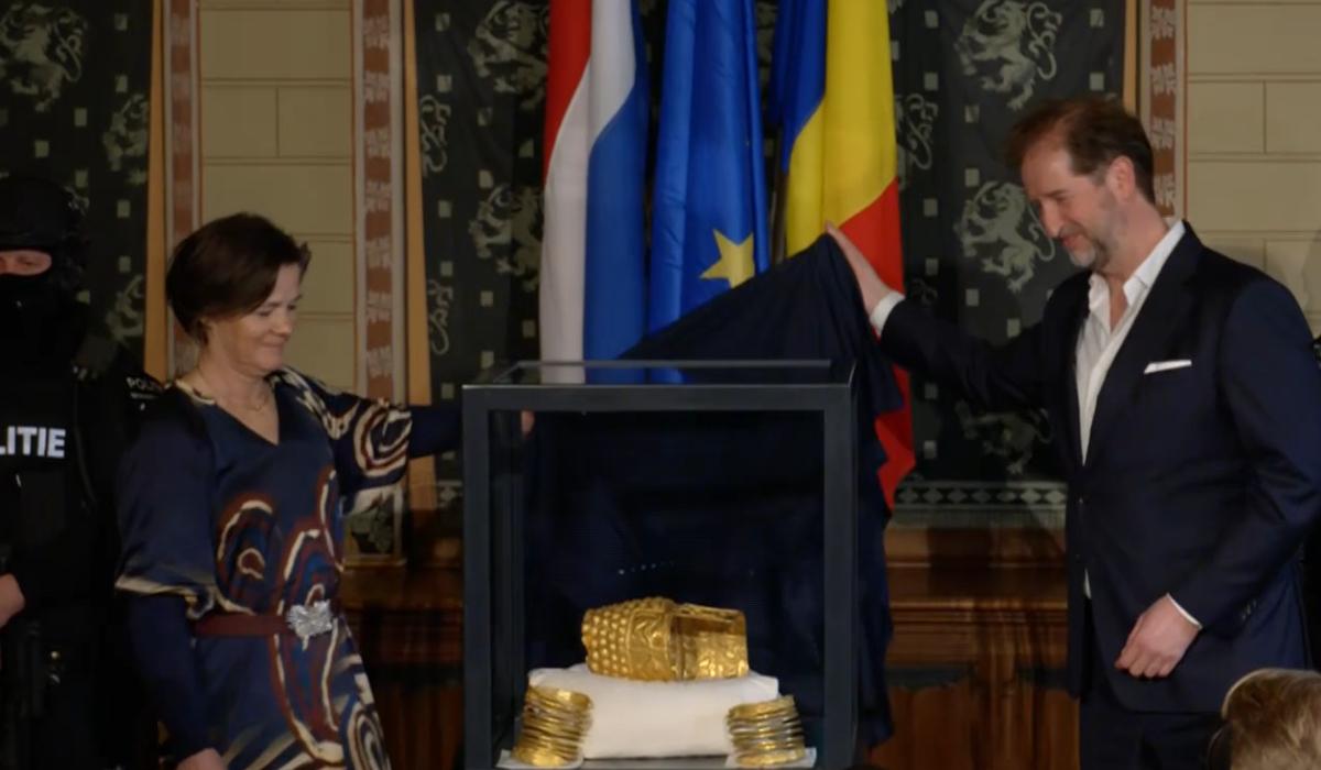 Primele imagini cu coiful de la Coţofeneşti şi două brăţări dacice din aur, recuperate | Sursa foto: Captură foto/ NOS.nl