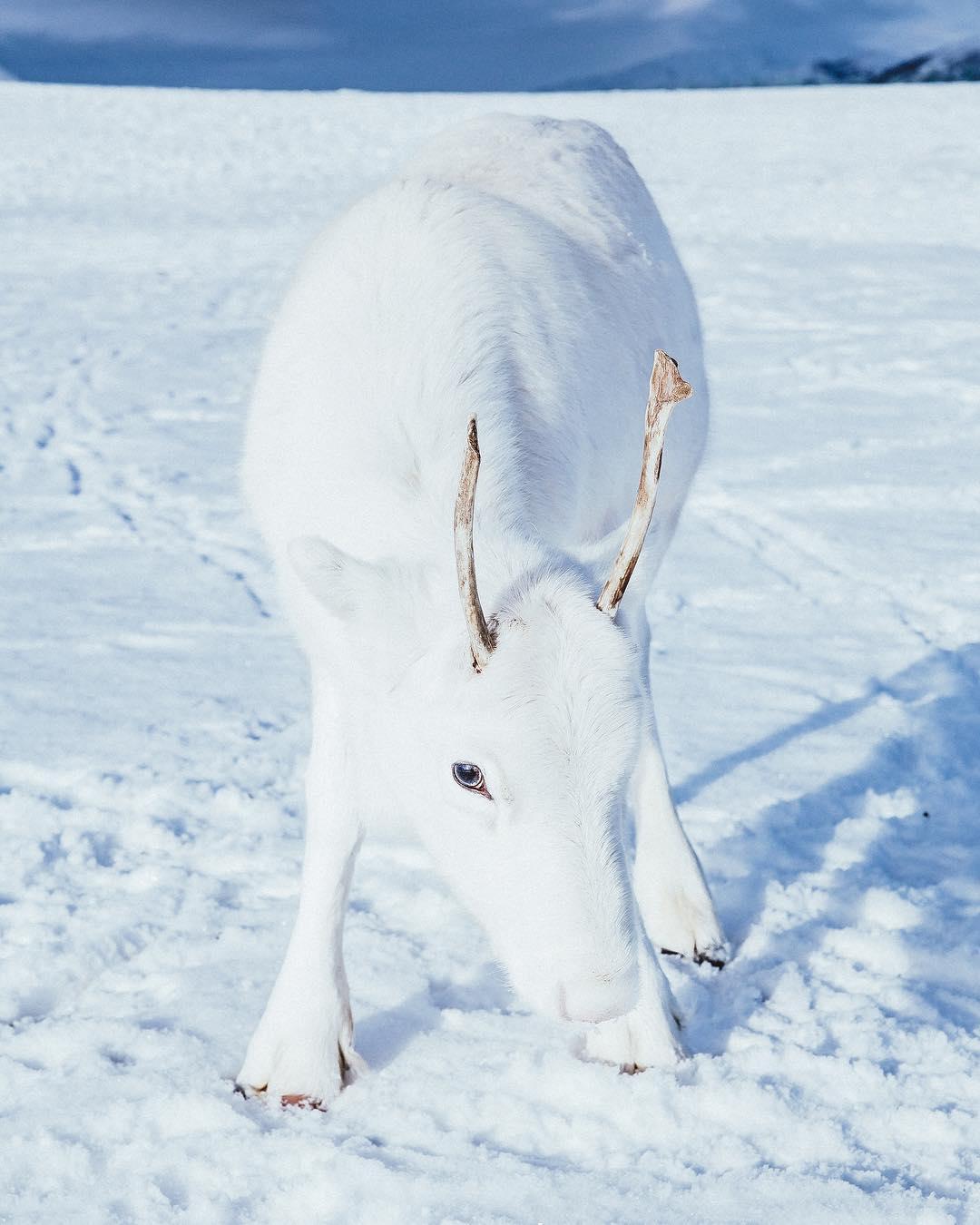 Un pui de ren alb ca zăpada, foarte rar, fotografiat în sălbăticie, în Norvegia