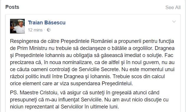Reacţia lui Traian Băsescu la decizia Preşedintelui Iohannis de a refuza numirea lui Sevil Shhaideh ca Premier