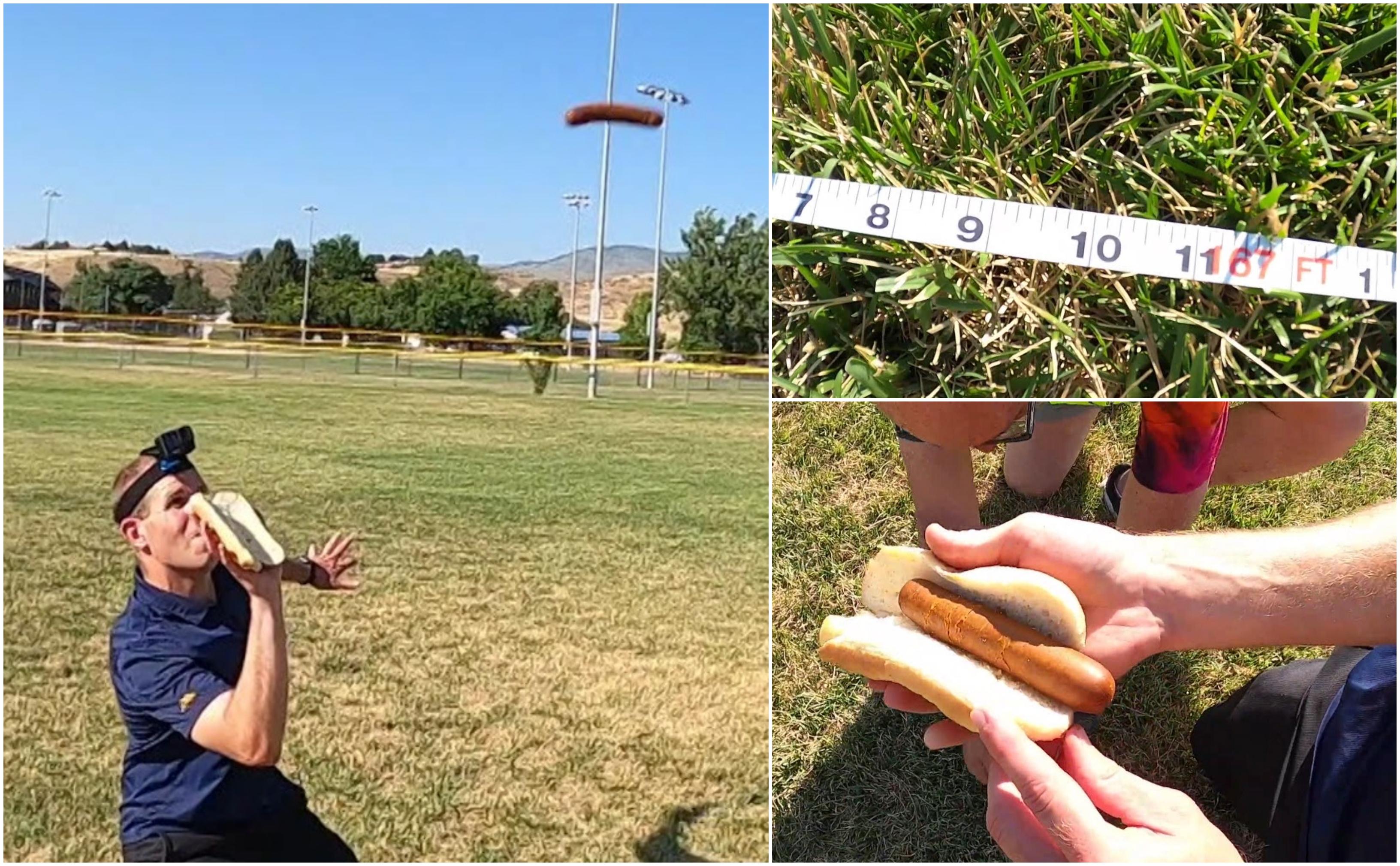 Record inedit: Cum a reușit un american să prindă într-o chiflă un crenvurst aruncat de la peste 50 de metri distanță