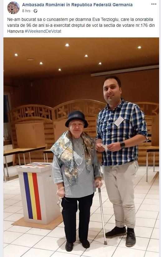 Alegătoarea nonagenară a venit la urne în cea de-a doua zi de vot în diaspora, în turul 2 | Sursa foto: Facebook/Ambasada României în Republica Federală Germania