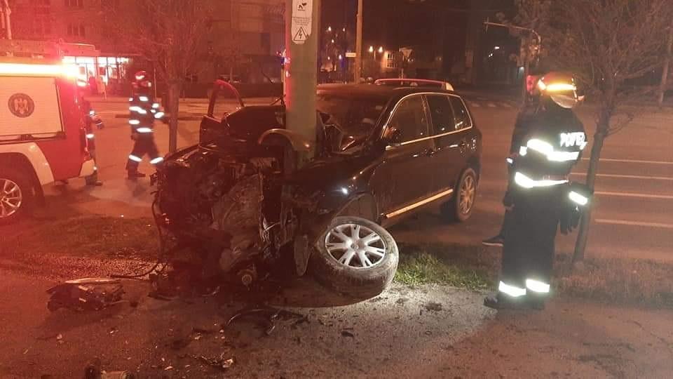 Rupt de beat, s-a încolăcit cu Touareg-ul pe stâlp, în Timișoara. Șoferul a ieșit din mașină teafăr și nevătămat