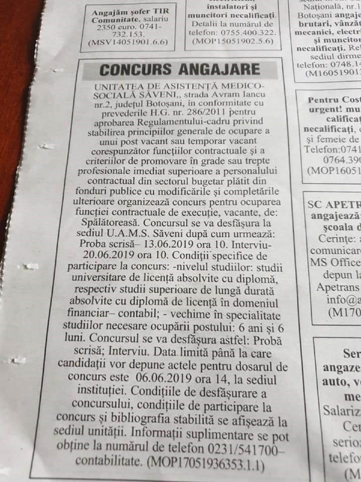 La Săveni se caută spălătoreasă cu licență în finanțe și 6 ani de experiență