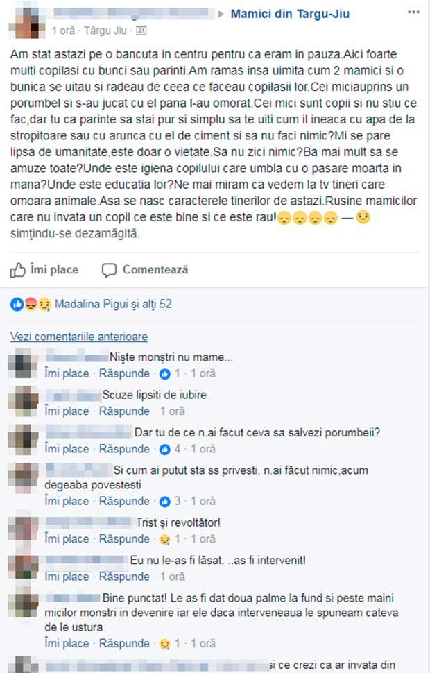 Scene şocante în Târgu Jiu: 'Copiii au prins un porumbel pe care l-au înecat şi l-au izbit de ciment!'