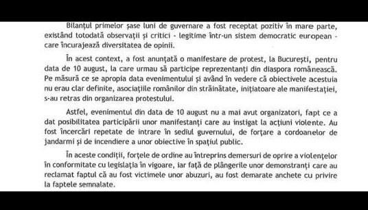 Guvernul ar fi trimis o scrisoare preşedintelui CE în care explică intervenţia jandarmilor la protestul din 10 august
