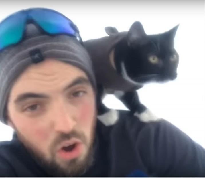 Şi pisicile adoră sporturile de iarnă! O felină aproape că zboară pe pârtie, în compania stăpânului său. Imagini VIRALE