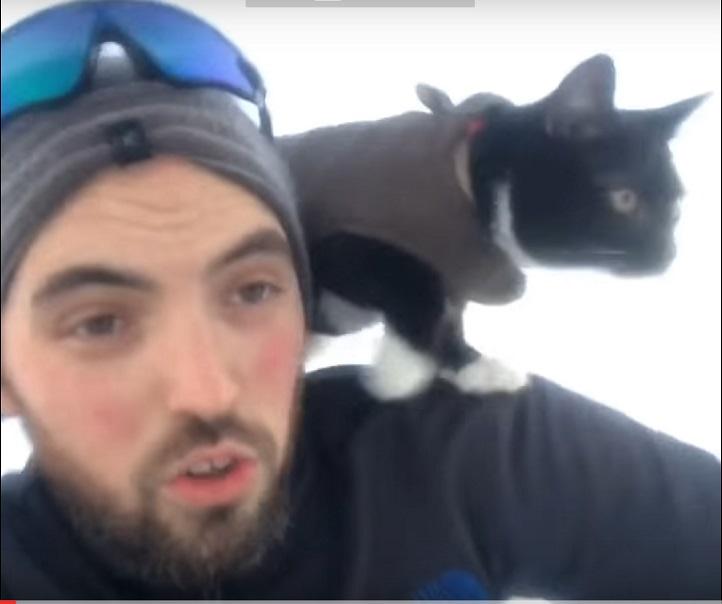 Şi pisicile adoră sporturile de iarnă! O felină aproape că zboară pe pârtie, în compania stăpânului său. Imagini VIRALE