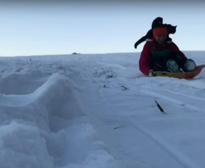 Şi pisicile adoră sporturile de iarnă! O felină aproape că zboară pe pârtie, în compania stăpânului său. Imagini VIRALE
