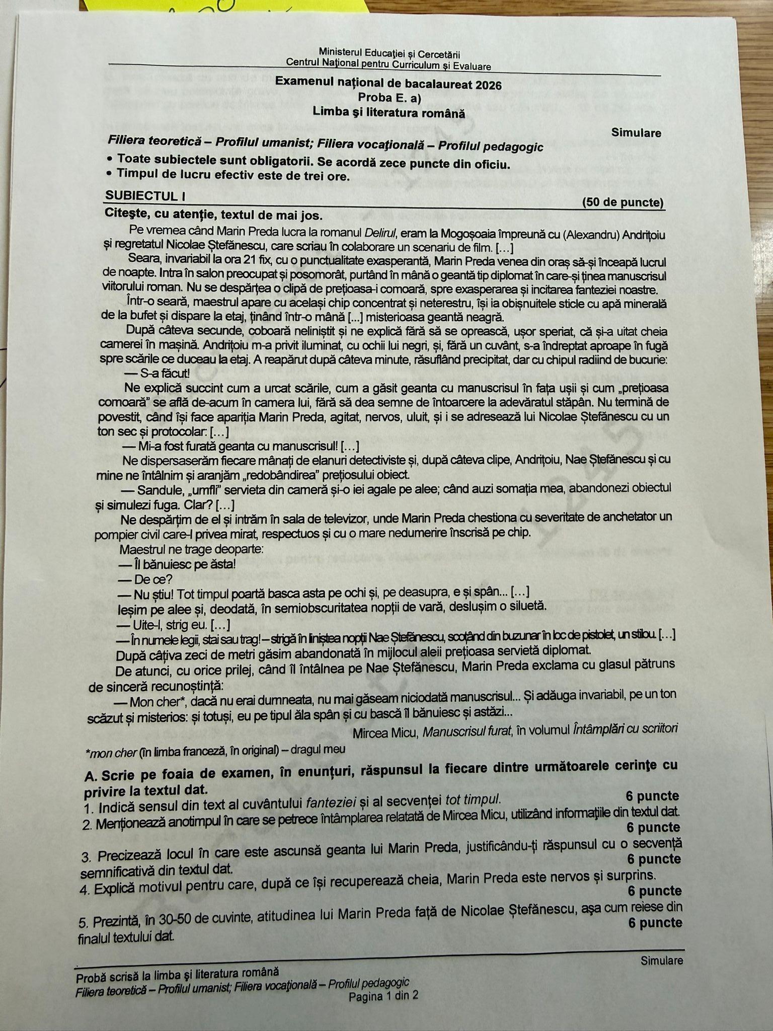 Simulare BAC 2026, subiecte la Limba română. Ce au avut de rezolvat elevii la subiectul III
