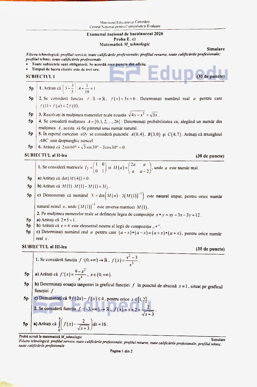 Simulare BAC 2026, subiecte la Matematică. Ce a picat la subiectul III
