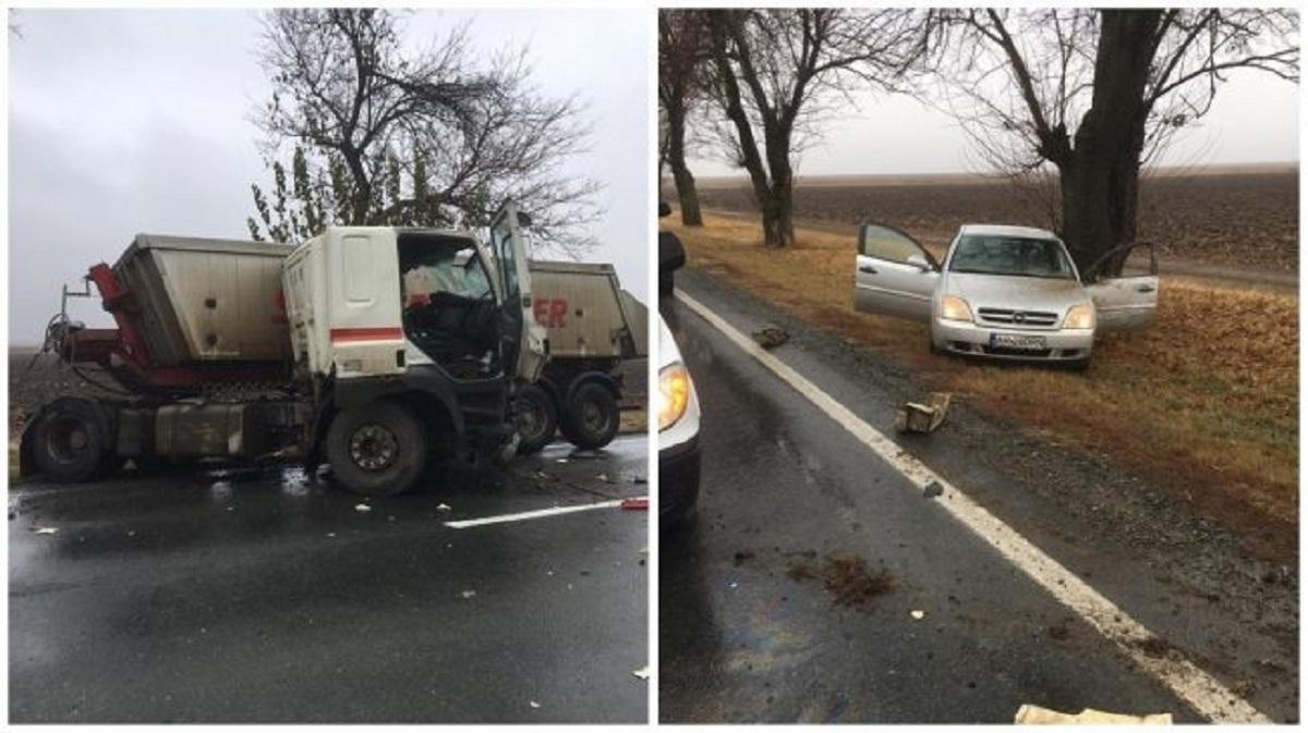 Un şofer de camion încarcerat, după un accident cu un autoturism, la Arad. Cabina s-a întors pe şosea