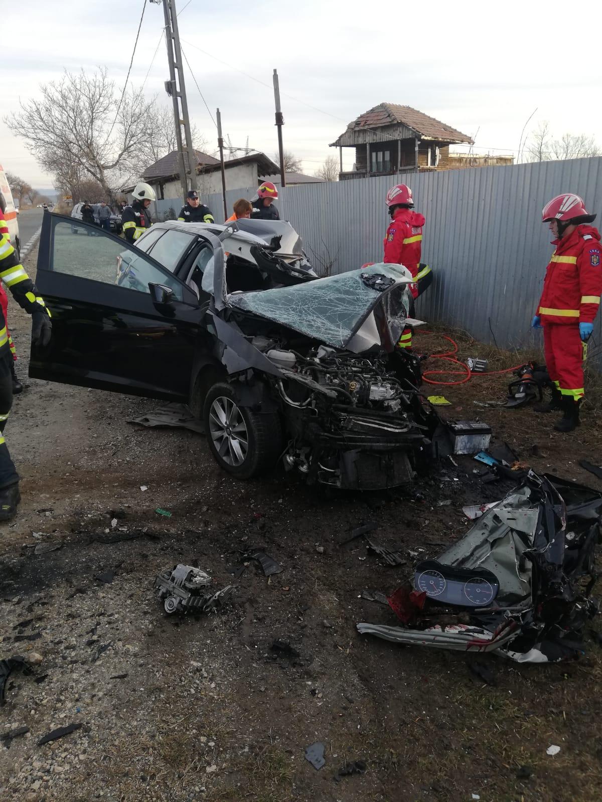 Șofer mort după ce a intrat cu mașina în TIR, pe un drum din Gorj. Bucăți din caroserie s-au împrăștiat pe șosea