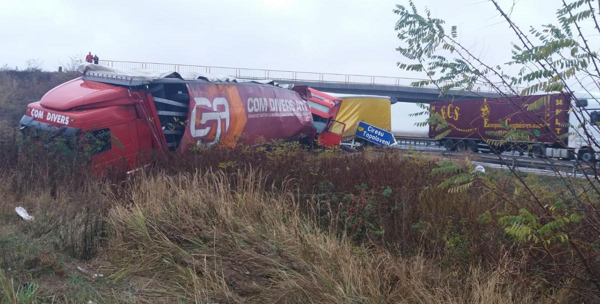 Un şofer de TIR iese din cabină pe geam, îngrozit, după ce l-a lovit un alt camion, pe A1, la Cireşu (video)