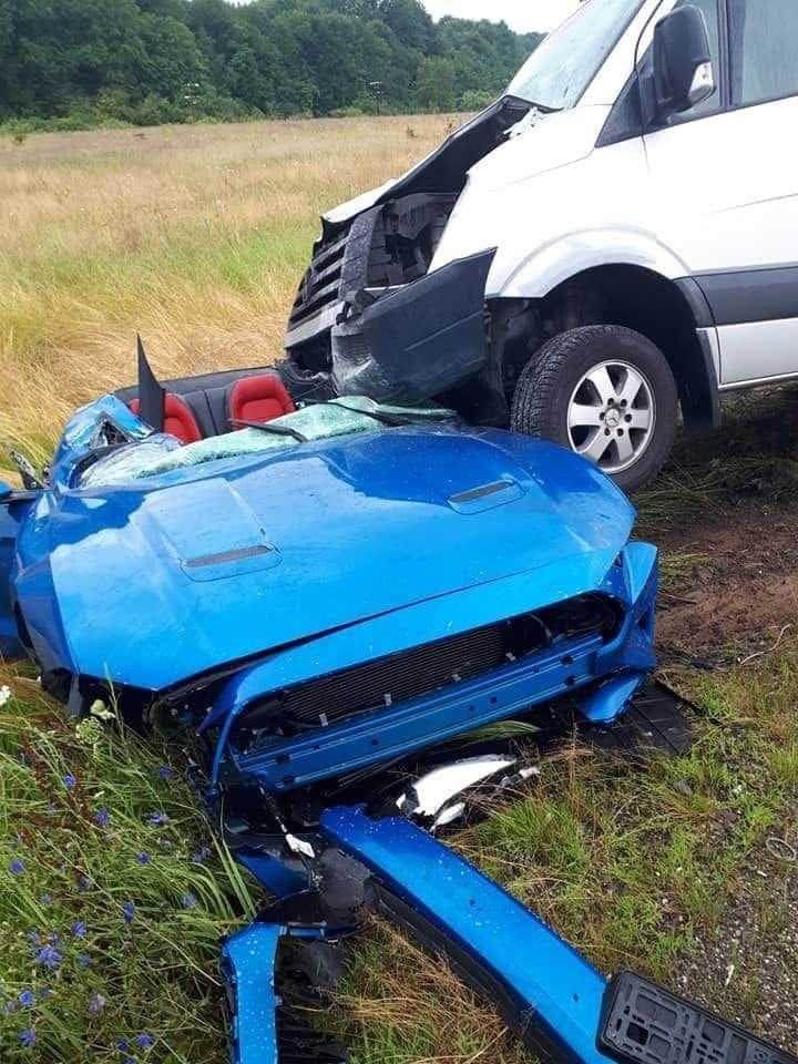 Șoferul unui Mustang, strivit de un microbuz urcat pe mașina lui, în apropiere de Brașov