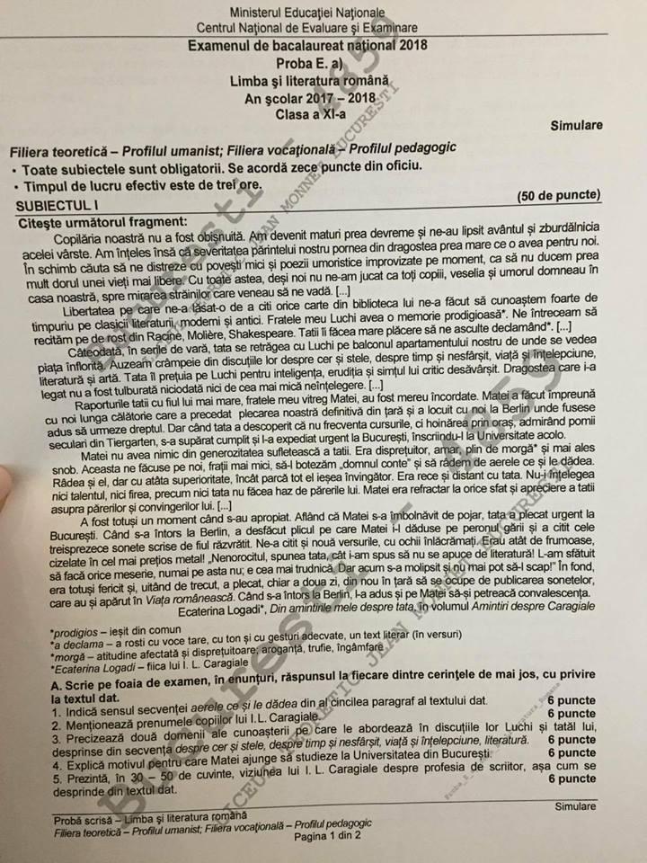 Subiecte simulare Bacalaureat 2018 la limba română. Ce subiecte au primit elevii claselor a XI-a și a XII-a