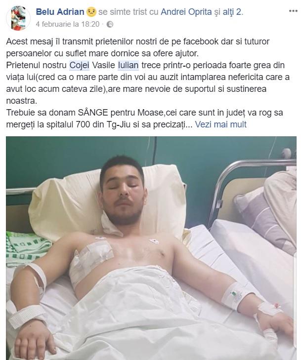 Tânărul înjunghiat pe stradă, la Bumbești Jiu, şi lăsat fără un picior, are nevoie de sânge pentru a supraviețui. Prietenii lui Iulian ne cer ajutorul pe Facebook (Video)