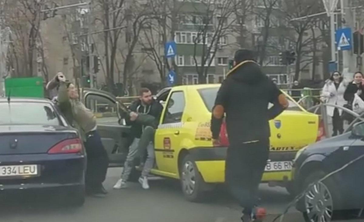 Video cu bătaie în trafic în București! Un taximetrist e tras de picioare din mașină și lovit cu pantoful de doi bărbați