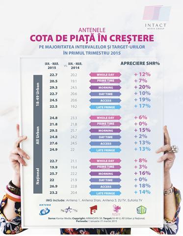 Televiziunile Intact Media Group, creșteri pe toate intervalele orare în primul trimestru al lui 2015