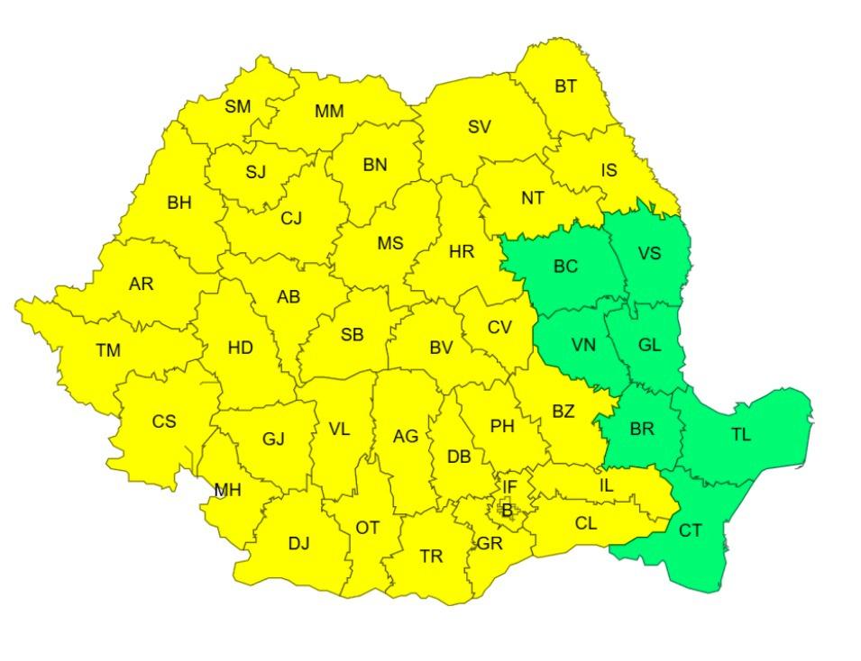 Cod galben de caniculă în mare parte din ţară, gridină şi vijelii în vest