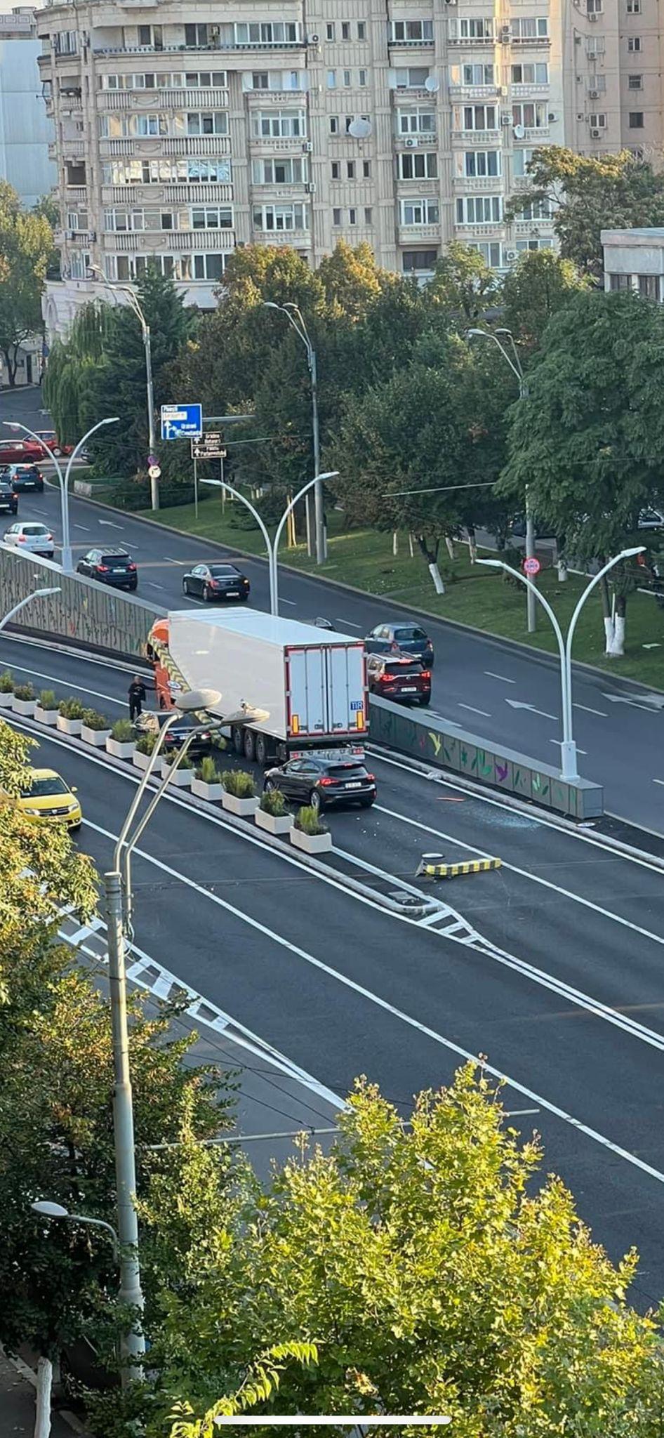 TIR blocat în Pasajul Unirii din Capitală, proaspăt reabilitat. Autotrenul a rupt limitatorul de înăltime