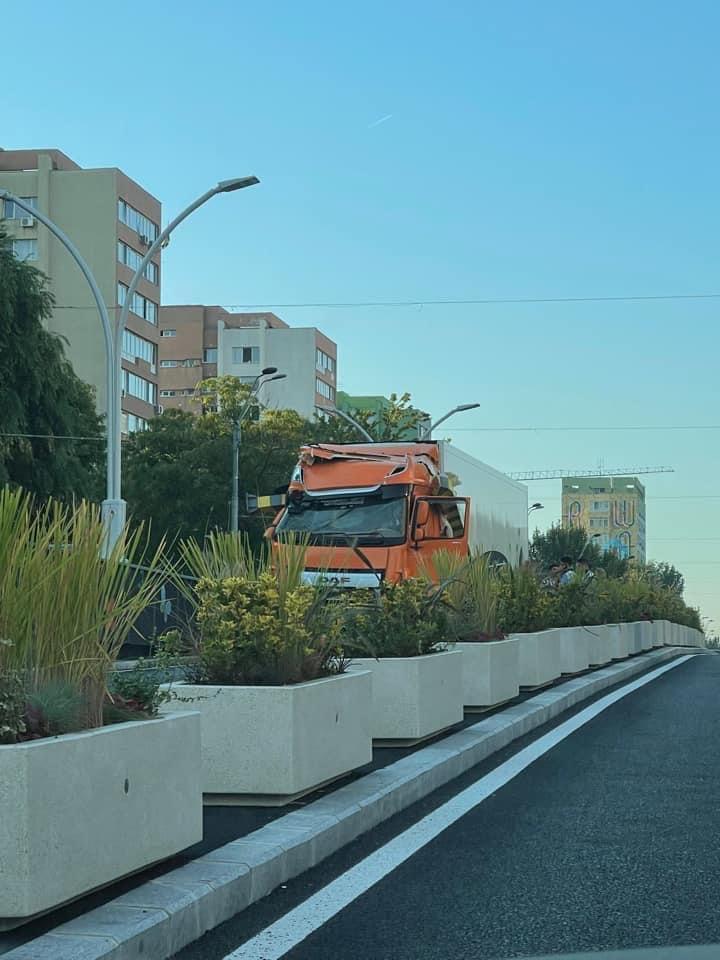 TIR blocat în Pasajul Unirii din Capitală, proaspăt reabilitat. Autotrenul a rupt limitatorul de înăltime
